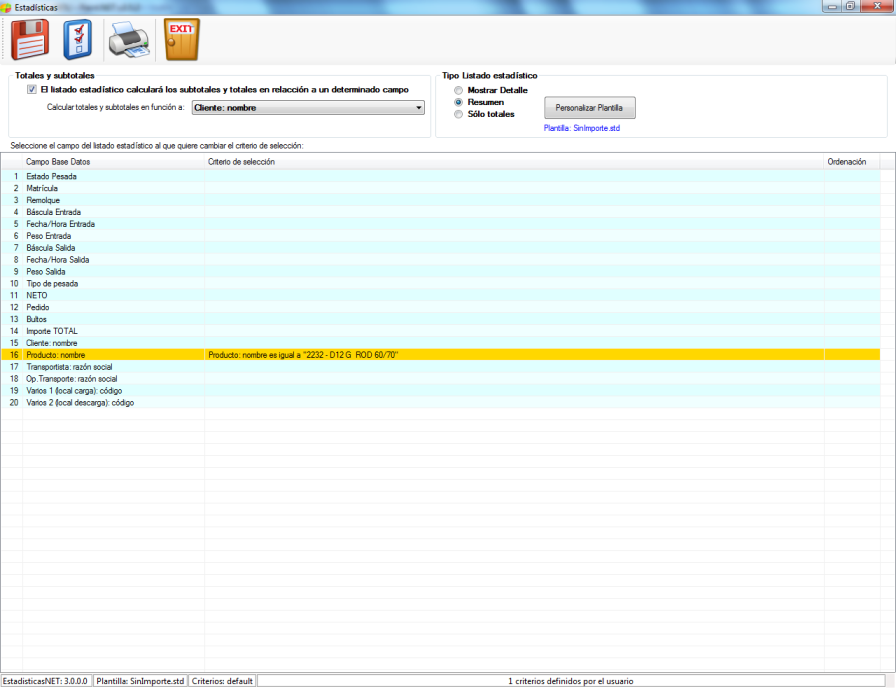 Es posible definir uno o varios criterios a modo de filtro, ordenar uno o varios campos, realizar una agrupación para mostrar los totales en función de un determinado concepto e incluso se pueden personalizar que campos aparecerán en el listado estadístico (esta última característica sólo en modo Resumen)