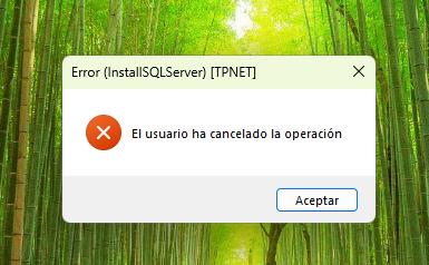 Una vez finalizada la instalación de SQL Server, al volver a ejecutar TP.NET, se volverá a mostrar el asistente de primera ejecución, sin embargo, al detectar la instancia de SQL Server, ya no se mostrará el mensaje ''El usuario ha cancelado la operación'' y el proceso de arranque finaliza correctamente.
