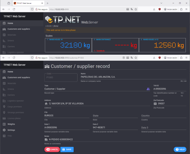 - Un serveur web intégré à TP.NET est désormais disponible. Il permet d'effectuer des opérations dans TP.NET directement depuis n'importe quel navigateur web, aussi bien depuis d'autres PC, tablettes ou mobiles, quel que soit le système d'exploitation (Windows, Mac, Linux, Android, iPhone, iPad, etc.). La version initiale du serveur web permet de voir en temps réel les balances configurées dans TP.NET, les clients / fournisseurs (nouveaux, à supprimer ou à modifier), les pesées en cours et les pesées terminées entre deux dates, ainsi que l'affichage à l'écran du bon de livraison, qui peut être réimprimé (*). * Remarque : la réimpression du bon de livraison à partir d'appareils mobiles peut nécessiter une configuration supplémentaire, et dans tous les cas, il s'agit d'un aspect qui n'est pas lié au serveur web. Dans les futures versions du serveur web, il sera possible de créer, modifier ou supprimer le reste des données de base (plaque d'immatriculation, produits, conducteurs, transporteurs, etc.) et d'effectuer des pesées.