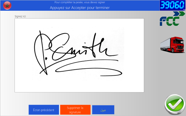 - Le module de pesage avec écran tactile (TP Touch) version 10.6 est désormais compatible avec le nouveau modèle d'imprimante de tickets introduit dans cette version de TP.NET. De plus, il sera désormais possible de demander une signature sur l'écran lui-même. De la même manière que le module de capture de signatures dans TP.NET, les signatures obtenues à partir de TP Touch peuvent être consultées dans le rapport de pesée et incluses dans l'impression du bon de livraison: